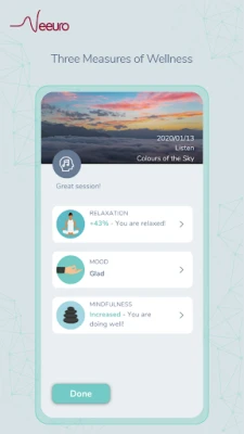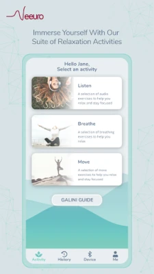 Votre parcours avec Galini est adaptable et progressif. Débutez par des sessions courtes de seulement trois minutes, idéales pour intégrer la pratique dans votre quotidien, puis augmentez graduellement la durée à mesure que votre compétence et votre aisance se développent. L'expérience Galini prend une dimension innovante grâce à son intégration transparente avec le Neeuro SenzeBand. Ce dispositif EEG non invasif, conçu pour capter les signaux cérébraux, fonctionne en symbiose avec Galini pour vous fournir un retour d'information en temps réel. Recevez des indications précises sur votre niveau de relaxation et de pleine conscience, vous permettant d'ajuster votre pratique et d'optimiser chaque instant passé avec l'application.