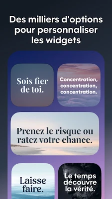 Avec l'intégration native des widgets iOS, enrichir votre écran d'accueil d'une dose quotidienne d'inspiration n'a jamais été aussi simple. Le widget **Motivation** se déploie avec élégance, vous permettant de visualiser une citation édifiante sans même ouvrir l'application. Personnalisable à souhait, de l'esthétique du texte aux couleurs, il s'adapte à votre style et peut être multiplié pour différentes sources d'inspiration. Plus qu'une simple lecture, **Motivation** vous invite à partager ces pépites de sagesse avec vos proches ou à les transformer en fonds d'écran inspirants, propageant ainsi l'onde positive.