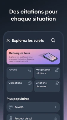 Plongez dans un univers de centaines de citations soigneusement sélectionnées, couvrant un spectre thématique vaste et diversifié : de l'estime de soi à la gestion du stress, en passant par les relations ou la persévérance. **Motivation** offre la possibilité de parcourir des livres enrichissants, de conserver vos passages préférés et de programmer des rappels personnalisés pour un soutien constant. Une option Premium déverrouille un accès illimité à toutes les catégories, supprime les publicités, permet des arrière-plans personnalisés et facilite la recherche ciblée, transformant votre expérience en un véritable havre de paix mental. Et pour une inspiration partout avec vous, **Motivation** est également compatible avec Wear OS.